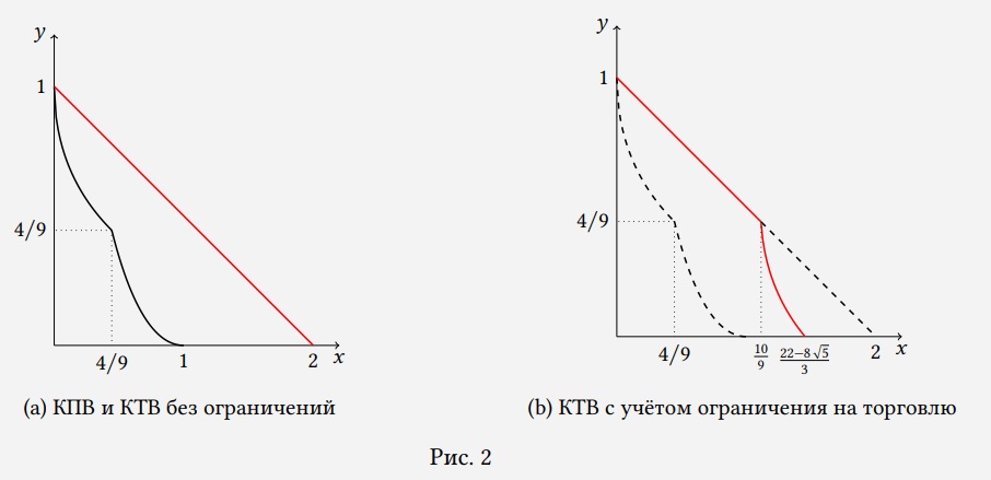 КТВ — прямая с наклоном 0,5, поскольку 1 единицу y обменивают на 2 единицы x. Наиболее высоко лежащая прямая, имеющая хотя бы одну точку пересечения с КПВ проходит через точку (0, \ 1) : y=1-0,5x, красная линия на рис. 2a.