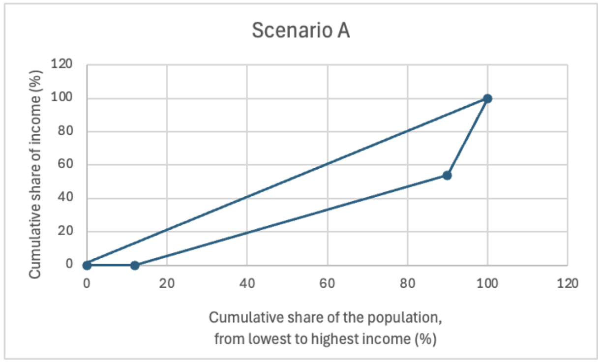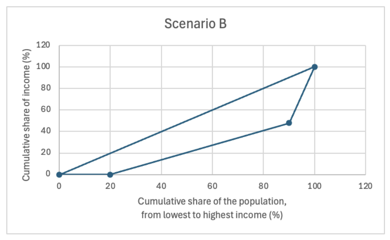 To calculate the Gini coefficient for Scenario B with the Lorenz curve connecting the points (0, 0), (20, 0), (90, 48), and (100, 100), one can follow these steps: