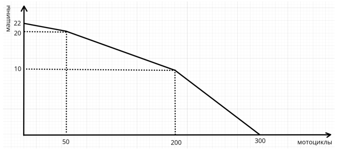 Компания, производящая машины и мотоциклы, хочет оценить свою КПВ. Известно, что максимальное количество мотоциклов, которое она может произвести, равно 300. Причем, альтернативные издержки первых 10 машин равны 10 мотоциклов за единицу, следующих 10 машин равны 15 мотоциклов за единицу, а всех остальных машин равны 25 мотоциклов за машину. Постройте КПВ данной компании в координатах (машины; мотоциклы).