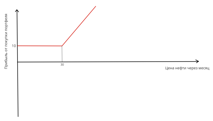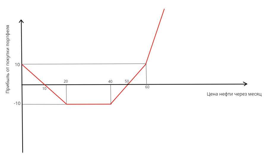 а) Рассмотрите следующий график зависимости прибыли от покупки одного опциона от цены нефти через месяц:
