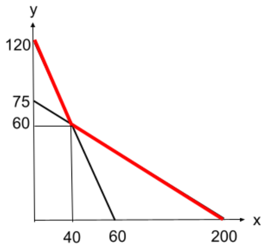 В данном случае суммарная КПВ Александра будет задаваться функцией y(x)=120-1,5x при 0\leq x<40 и y(x)=75-0,375x при 40\leq x\leq 200. ( 1 балл за аналитическую запись КПВ)