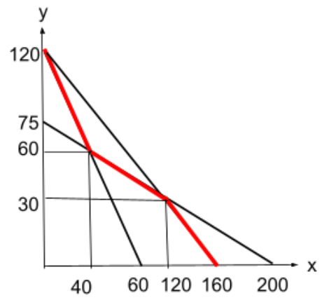 y(x)=120-1,5x при 0\leq x<40, y(x)=75-0,375x при 40\leq x\leq 120 и y(x)=120-0,75x при 120<x \leq 160.