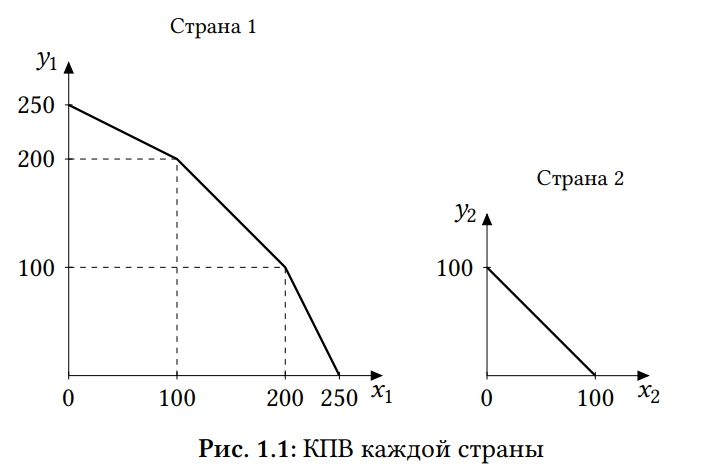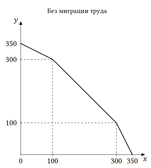 В стране 1 могут производиться два товара –– X и Y. Есть две технологии производства товара X –– старая и новая. При производстве по старой технологии одна единица труда производит одну единицу товара X. При производстве по новой технологии одна единица труда производит две единицы товара X, однако произвести по новой технологии можно не более 200 единиц товара X, так как количество станков, нужных для производства по этой технологии, в стране ограничено. Для товара Y ситуация абсолютно такая же: есть такие же технологии с таким же ограничением для новой технологии. В стране 1 есть 150 единиц труда. Страна 2 ничем не отличается от страны 1, кроме того, что в ней есть не 150, а только 50 единиц труда.