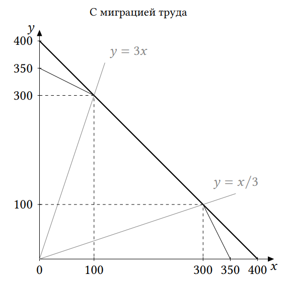 В стране 2 из-за небольшого населения возможности производства по новой технологии недоиспользуются, и мы можем это исправить, направив в страну 2 труд из страны 1. По сути дела мы получаем одну большую страну, в которой 150+50=200 единиц труда, причем по новой технологии можно произвести не более 200+200=400 единиц каждого товара. 200 единиц труда как раз и могут произвести максимально 400 единиц, так что весь труд можно задействовать в производстве по новой технологии. Альтернативные издержки равны 1, и общая КПВ есть линейная функция Y=400-X.