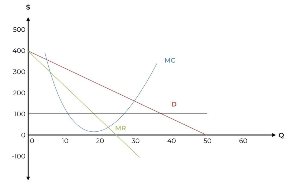 Monopolis has only one business selling marble and doesn't allow for imports. At the same time, this monopolist can sell their products to the perfectly competitive global market for $100. According to the following diagram, which is the best practice?