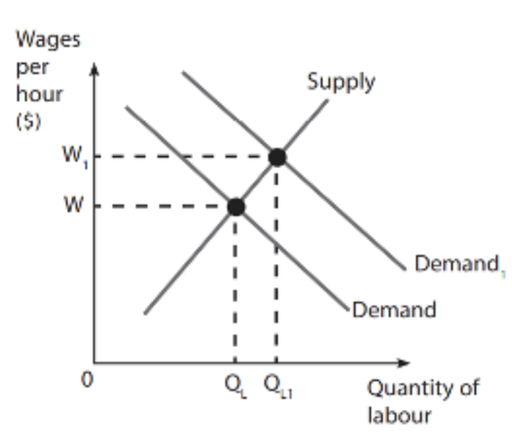 The diagram shows a competitive labor market. Which one of the following could NOT cause the increase in the wage rate from W to W1 as shown in the diagram?
