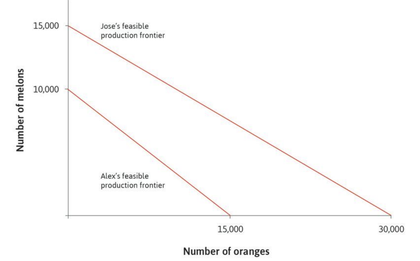 The following diagram shows Alex's and Jose's feasible production frontiers for oranges and melons. (Resourse allocation is equal between them.)
