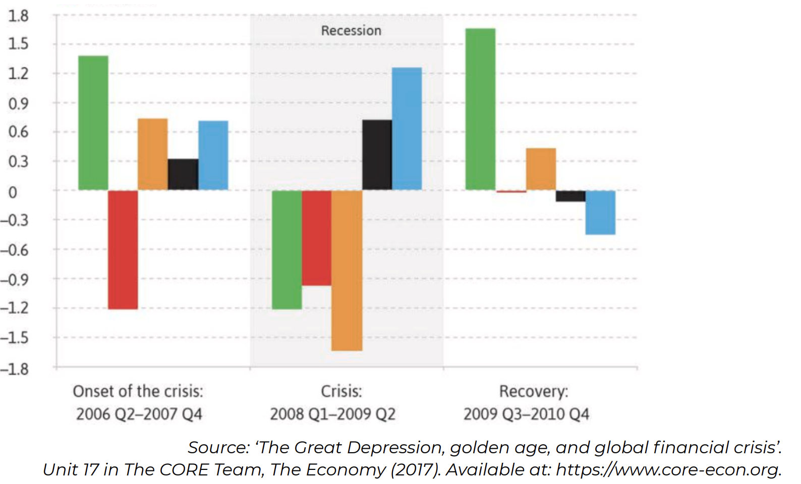 In this diagram, you can see the contribution of different components of the aggregate demand to the U.S. GDP change during the global financial crisis (in annual percentage points). The bars represent government spending, net exports, private consumption, residential and non-residential investment.