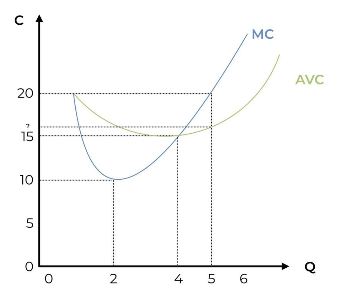 The following figure represents a company operating under perfect competition. Its net profit is zero, when selling 5 units.Its fixed cost is: