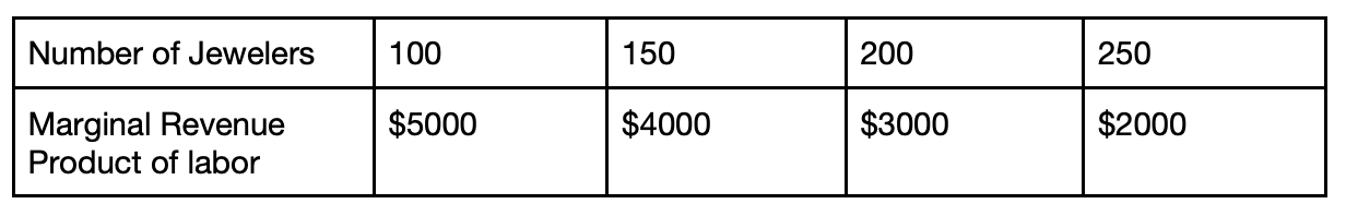 Mr. Gold is the CEO of a company that makes silver rings. This company operates under perfect competition and its factors of production are homogeneous. When deciding how many jewelers he should hire, he decides to look at the marginal revenue of the product of labor, which is as shown in the following matrix. The fixed wage is $3000. How much might be Mr. Gold's total revenue?