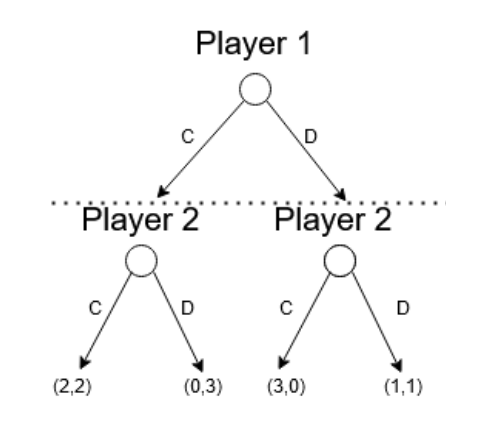 When the topic "Game Theory" is mentioned, the first thing that comes to mind is an nxm (usually 2x2) Matrix (Normal Form). However, that is not the only way to represent a game. There are other forms, such as extensive form, which consists of a tree: