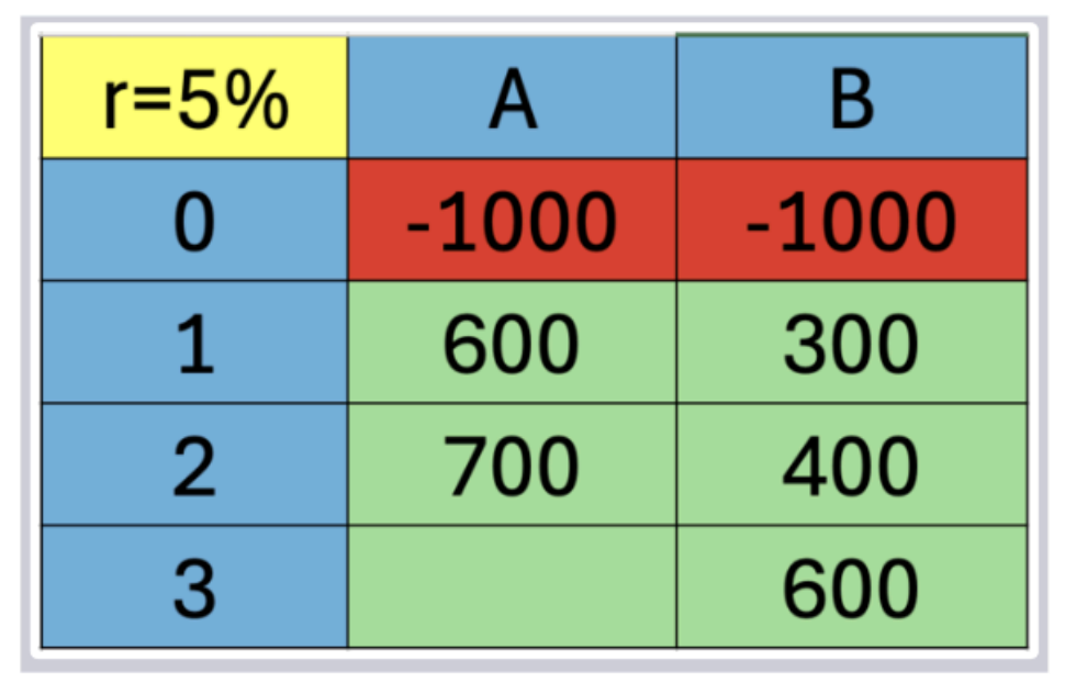 You are considering an investment of $1,000 in one of two alternative projects, A and B. Your required discount rate is 5%. Based on the cashflows of each project, which of the following statements is correct?