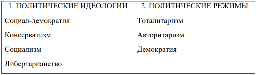 Тоталитаризм, социал-демократия, консерватизм, социализм, демократия, плюрализм, авторитаризм, либертарианство