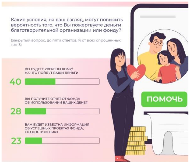 Определяющий фактор – уровень доверия ( 1 балл). Граждане, доверяющие известным им благотворительным фондам и организациям, вдвое чаще россиян в целом оказывают им финансовую поддержку ( 38\% против 20\% ) ( 1 балл).
