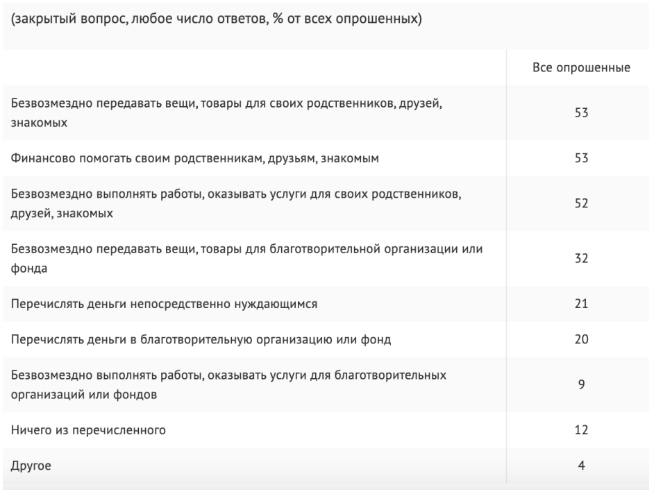 1) Более половины сообщили, что за последние год-полтора они на безвозмездной основе передавали вещи, товары своим родственникам, друзьям, знакомым (53\% ).