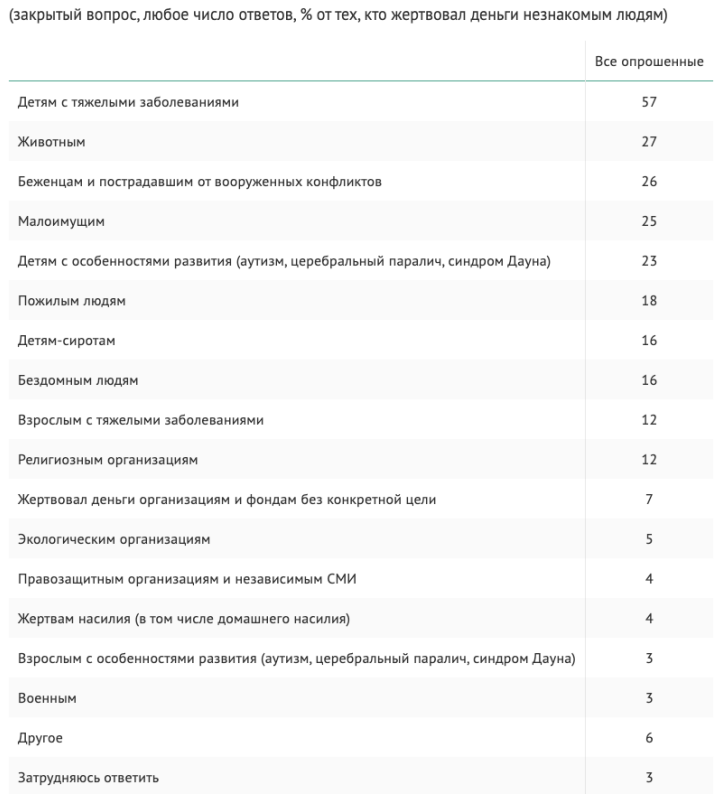 3. За последние полтора года практика пожертвований незнакомым людям носила преимущественно единовременный характер. Проведите сравнительный анализ ответов россиян и определите, кто был основным адресатом этих пожертвований. Свой ответ обоснуйте.