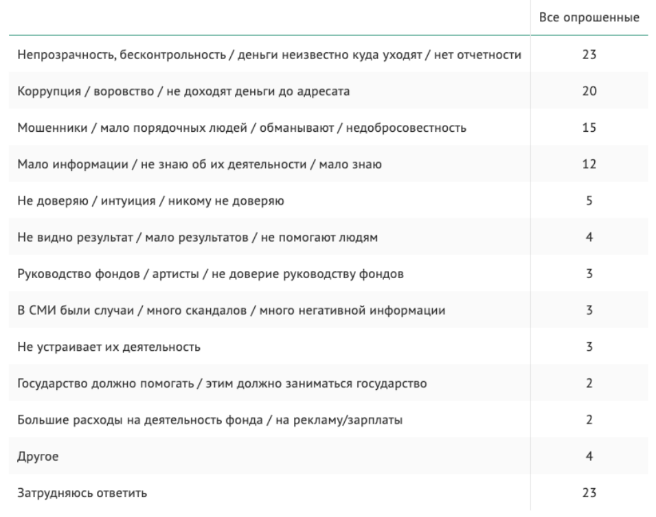 Возможное обоснование: в числе ключевых причин — непрозрачность, бесконтрольность их деятельности ( 23\% среди тех, кто не доверяет), воровство денежных средств ( 20\% ), вероятность обмана ( 15\% ); каждый восьмой назвал недостаток информации о благотворительных организациях, свою слабую информированность об их деятельности ( 12\% ). ( 1 балл)