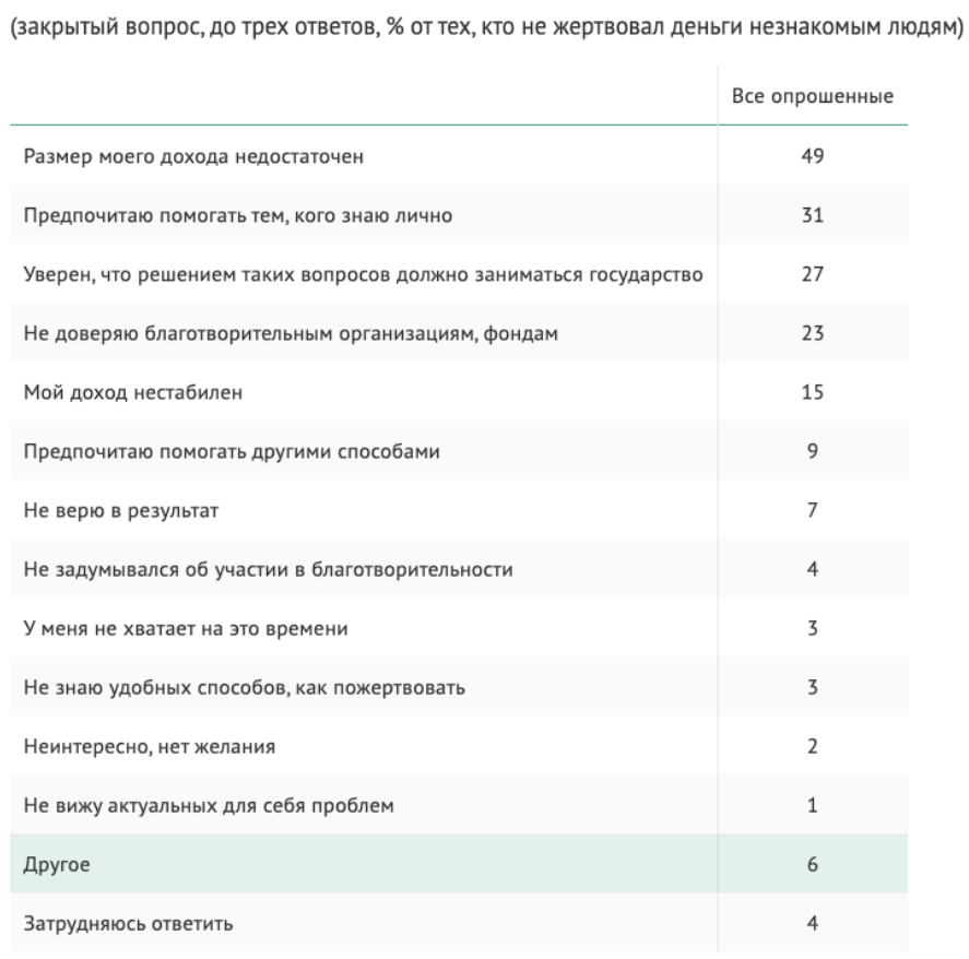 У людей бывают разные причины, почему они предпочитают не жертвовать деньги на благотворительность. Скажите, пожалуйста, какие из следующих утверждений лучше описывают Ваши причины? Вы можете выбрать до трех ответов.