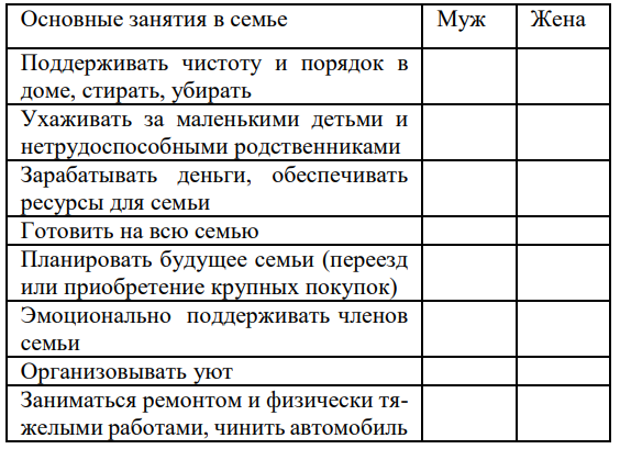 9. Ниже представлены занятия в семье. Отметьте в каждой строке, кто из супругов должен их выполнять в семье?
