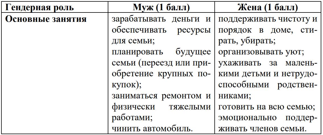 2) Распределите основные занятия супругов, приведенные в вопросе анкеты 9, согласно гендерным ролям в патриархальной семье.