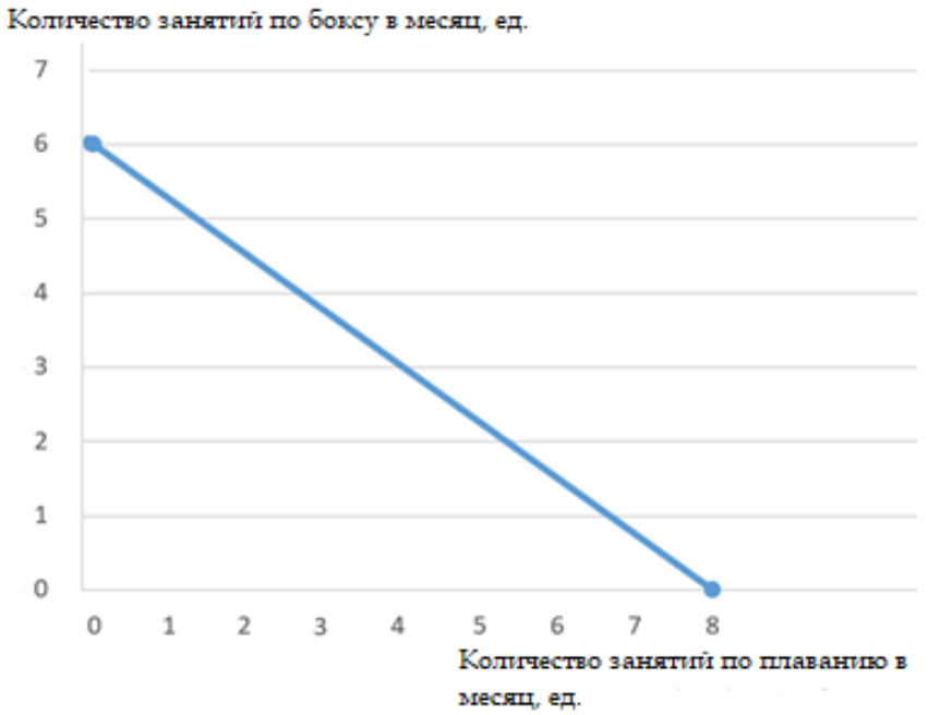 Определите общую сумму затрат в месяц, которую Иван готов тратить на спортивные мероприятия, если его бюджетная линия представлена на графике.