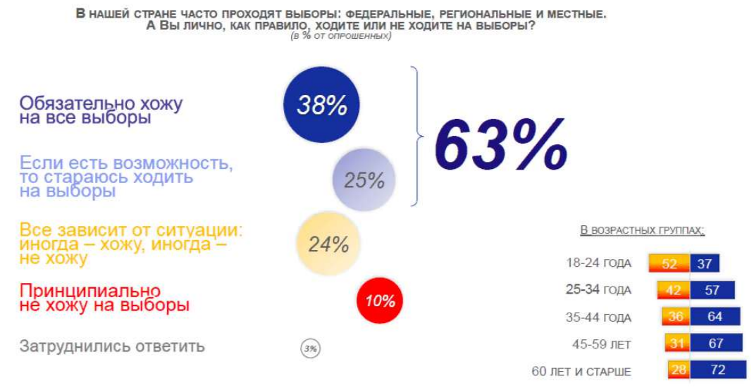 Рисунок 1 : молодежь 18-24 года, 52\% избирателей принципиально/ периодически не ходят на выборы; только 37\% от этой категории обязательно ходят на выборы.