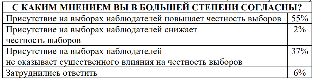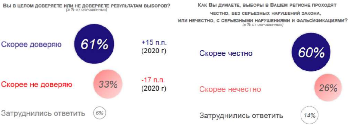 «В целом доверяете или не доверяете результатам выборов?», «Как вы думаете, выборы в вашем регионе проходят честно, без серьезных нарушений закона, или нечестно, с серьезными нарушениями и фальсификациями?».