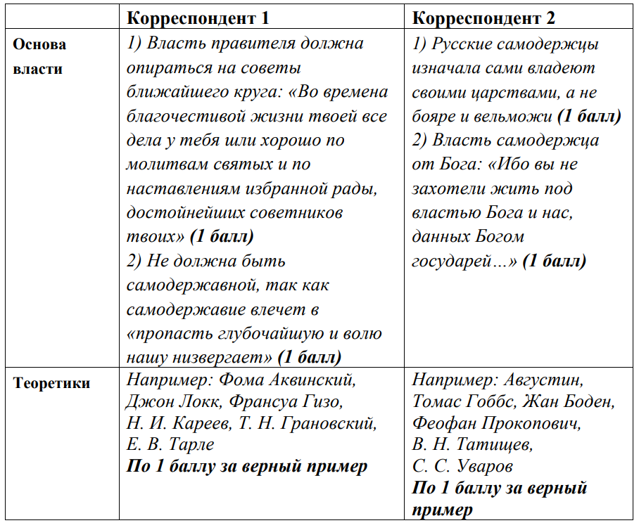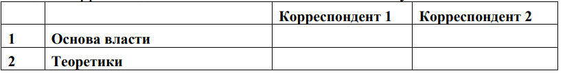 2) Какова по мнению каждого корреспондента основа власти? Приведите по два соответствующих утверждения оппонентов. Назовите имена двух теоретиков, которые придерживались таких же политических взглядов, что и каждый корреспондент. Свой ответ впишите в таблицу.