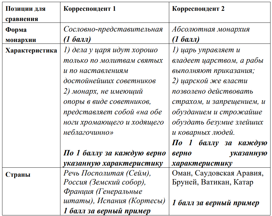 3) Какую форму монархии считает оптимальной каждый корреспондент? Приведите не менее двух характеристик из текста, позволяющих подтвердить ваш вывод. Укажите две современные страны, в которых существуют эти формы монархии, а если в современном мире таковых нет, то назовите любые два из известных вам исторических примеров. Впишите ответ в таблицу.