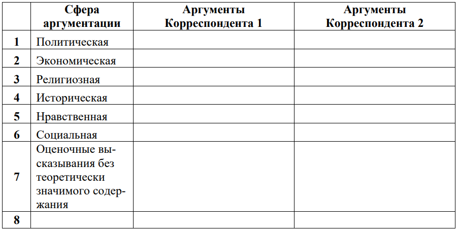 Приведите до трех аргументов каждого из корреспондентов для каждой из сфер, которые сможете выявить в их письмах, сформулировав суть аргумента. Впишите свой ответ в таблицу. Помните, что указанные в таблице сферы аргументации могут быть избыточными или, наоборот, недостаточными.