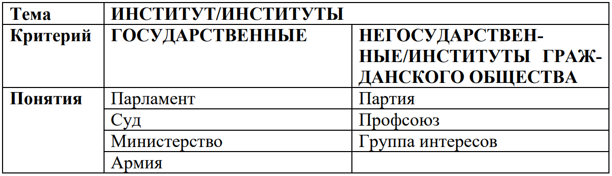 Парламент, партия, суд, армия (вооруженные силы), транснациональная корпорация, профсоюз, группа интересов, министерство.