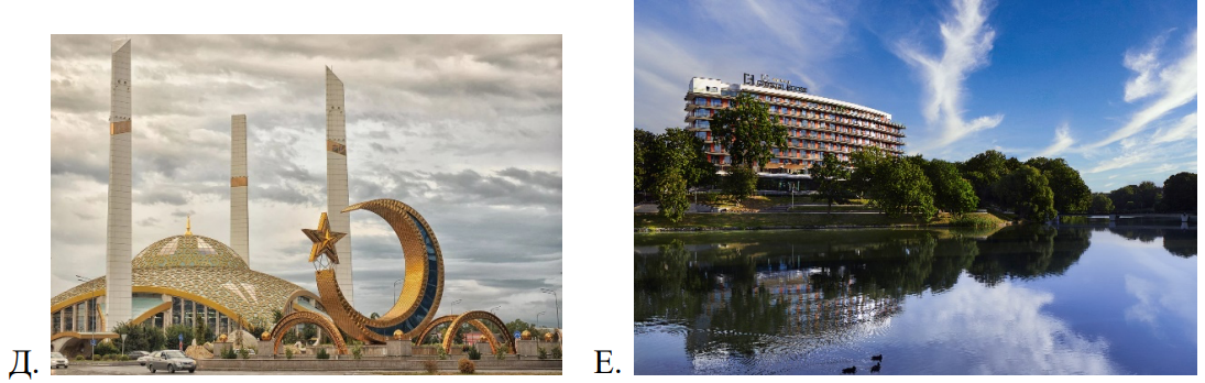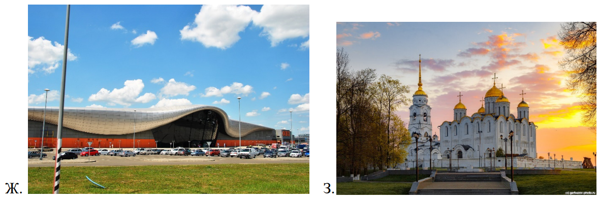 \begin{array}{|l|c|c|c|c|c|c|c|c|c|c|} \hline & 1 & 2 & 3 & 4 & 5 & 6 & 7 & 8 & 9 \\ \hline \text{A. Понятие (цифра)/изображение (буква)} & 1 & З & 8 & В & А & 3 & \text{Г*} & \text{Е*} & \text{Ж} \\ \hline \text{B. Что именно изображено?} & & \text{Церковь/собор} & & \text{Опера/театр} & \text{вокзал} & & \text{спортивная арена} & \text{отель} & \text{торгово-развлекательный центр} \\ \hline \end{array} По 1 баллу за каждую верно заполненную позицию в таблице ( ^* очередность ответов в столбцах 7 и 8 может быть обратная). 1 балл за все верные подписи выбранных изображений.