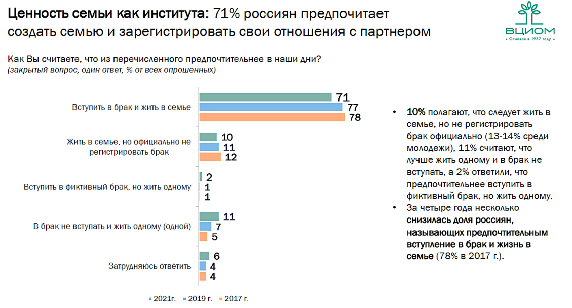 За четыре года несколько снизилась доля россиян, называющих предпочтительным вступление в брак и жизнь в семье ( 78\% в 2017 году, 71\% – в 2021 году). Напротив, количество желающих жить одному (одной) – увеличилось почти в два раза (в 2021 году 11\% считают, что лучше жить одному и в брак не вступать, а 2\% ответили, что предпочтительнее вступить в фиктивный брак, но жить одному. ( 1 балл)