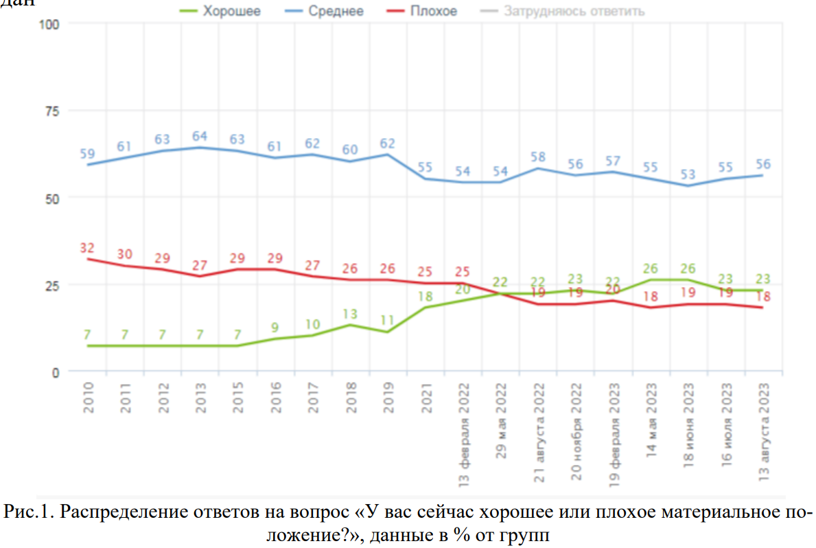 Анализ диаграммы на Рисунке 1, где графически представлен ответ на вопрос «У вас сейчас хорошее или плохое материальное положение?», показал, что 18\% россиян оценили свое материальное положение как плохое на момент опроса 13 августа 2023 года.