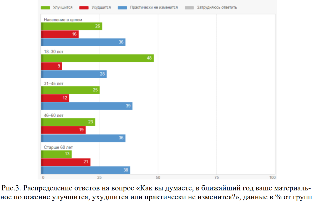 Нет, исходя из данных диаграммы на Рисунке 2, наиболее оптимистичные материальные ожидания наблюдаются у молодежи 18-30 лет, 48\% из них отмечают, что в ближайший год их материальное положение улучшится.