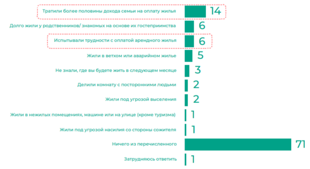 Социолог сможет определить риски бездомности, так как те, кто выбирал ответ на предложенные вопросы не имеют собственного жилья и часть из них испытывает трудности с оплатой арендованного жилья (ответы обведены красным пунктиром), в отличие от 71\% которые выбрали вариант ответа на вопрос «ничего из перечисленного». (допускаются иные формулировки, соответствующие правильному пониманию вопроса).