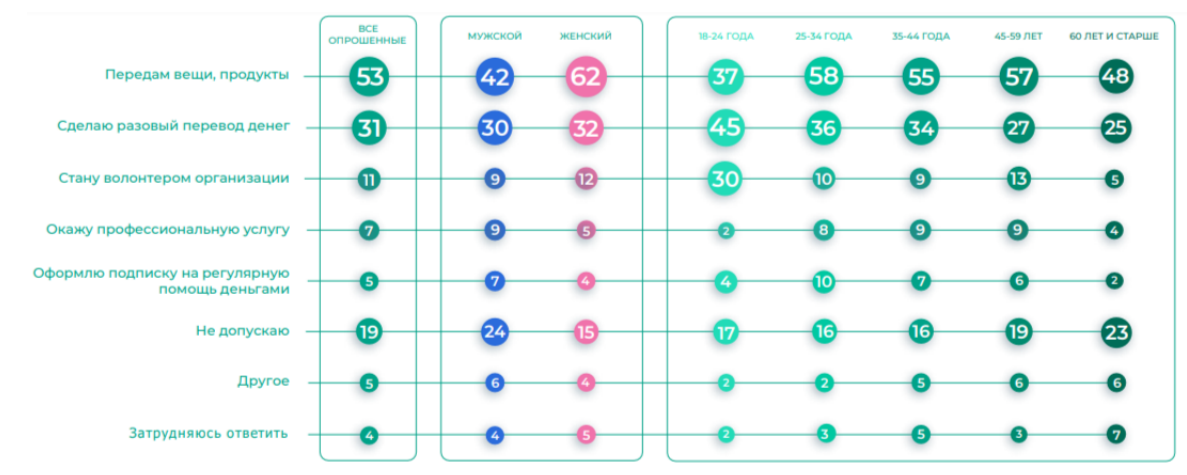 Молодежь 18-24 лет. Согласно данным на Рисунке 2, 30\% из них рассматривают возможность стать волонтером организации, 45\% допускают помощь в виде разового денежного перевода.