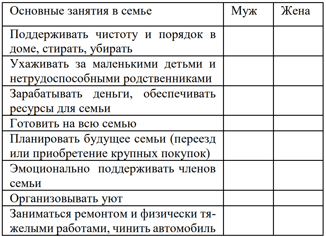 9. Ниже представлены занятия в семье. Отметьте в каждой строке, кто из супругов должен их выполнять в семье?