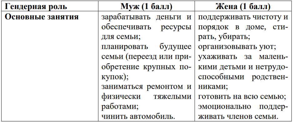 2) Распределите основные занятия супругов, приведенные в вопросе анкеты 9, согласно гендерным ролям в патриархальной семье